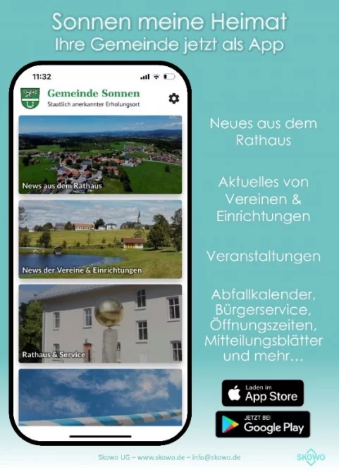 Wir freuen uns den Bürgerinnen und Bürgern der Gemeinde Sonnen eine Möglichkeit bieten zu können, über alle wichtigen Informationen rund um die Gemeinde auf dem Laufenden zu bleiben. Mit nur wenigen Klicks haben Sie Informationen von Vereinen, aktuelle Termine, Neuigkeiten aus dem Rathaus, Öffnungszeiten, Abfallkalender, Gemeindeblatt und vieles mehr.